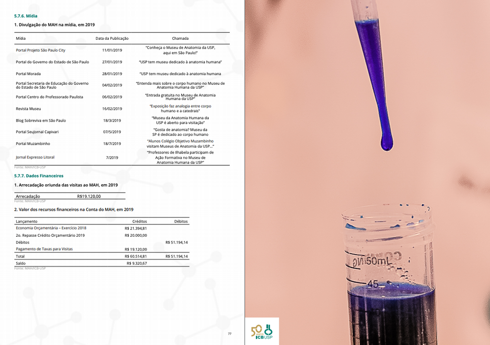 O projeto final em formato digital pode ser encontrado na página do ICB-USP: https://ww3.icb.usp.br/anuario-estatistico-e-annual-report-2019-do-icb-usp-estao-disponiveis/